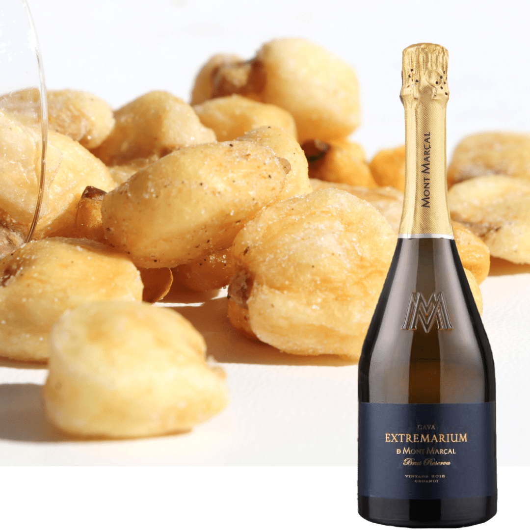 また旨みのあるスパークリングワインと合わせていただくと、双方の旨みや甘みがさらに引き立ち、さらには泡でジャイアントコーンの塩味をすっきりとさせてくれるたまらないマリアージュに。