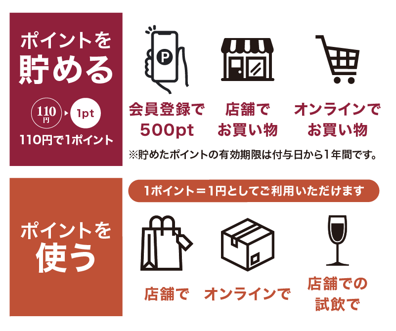「ヴィノスポイントクラブ」と、ヴィノスやまざきの店舗とオンラインショップで、お買い物に応じてポイントが貯まるお得なサービスです。ポイントが貯まるほか、特典もご用意しております。
