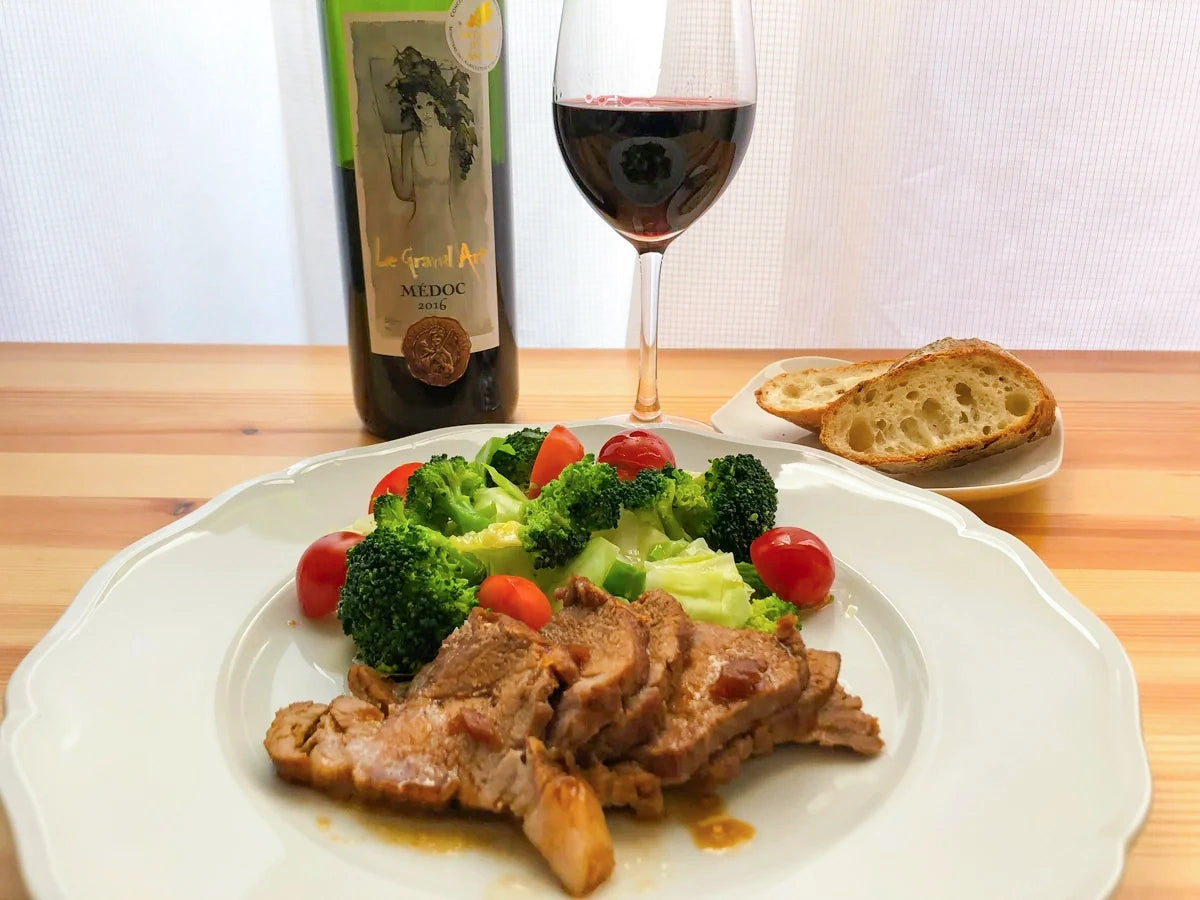 しっかりとした赤ワインなので、シンプルに塩こしょうで味付けしたステーキ(に煮詰めた赤ワインソースをかけるのも絶品)や、写真のようなチャーシュー風の豚肉のソテー、ミートソースやビーフシチューなどと合わせると本当に美味しいです。