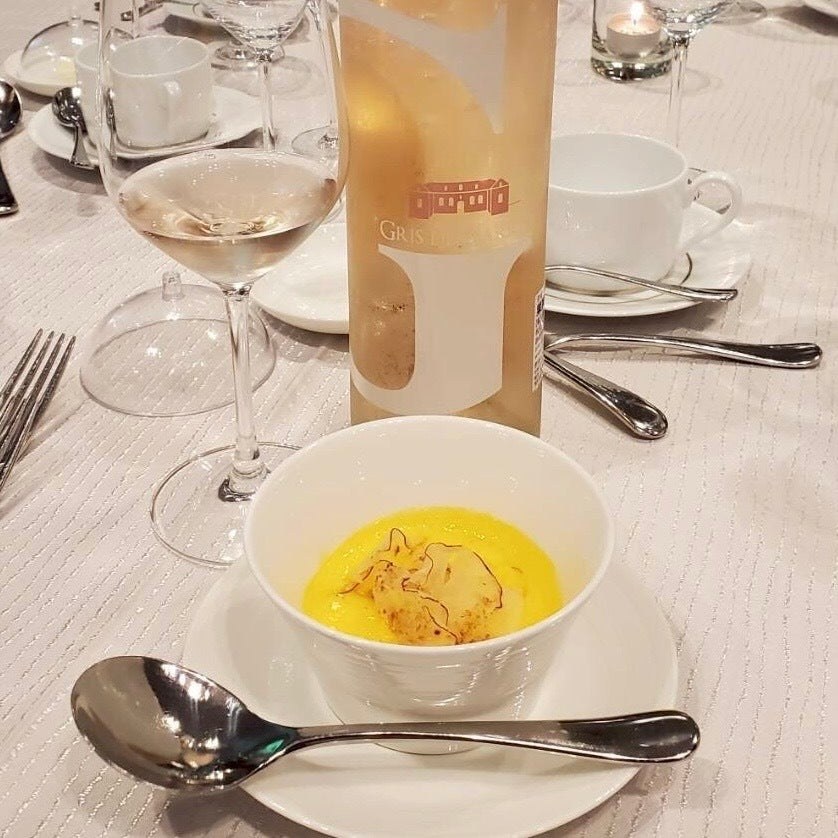 パーティーでは秋らしいさつまいもと人参のポタージュとペアリング。