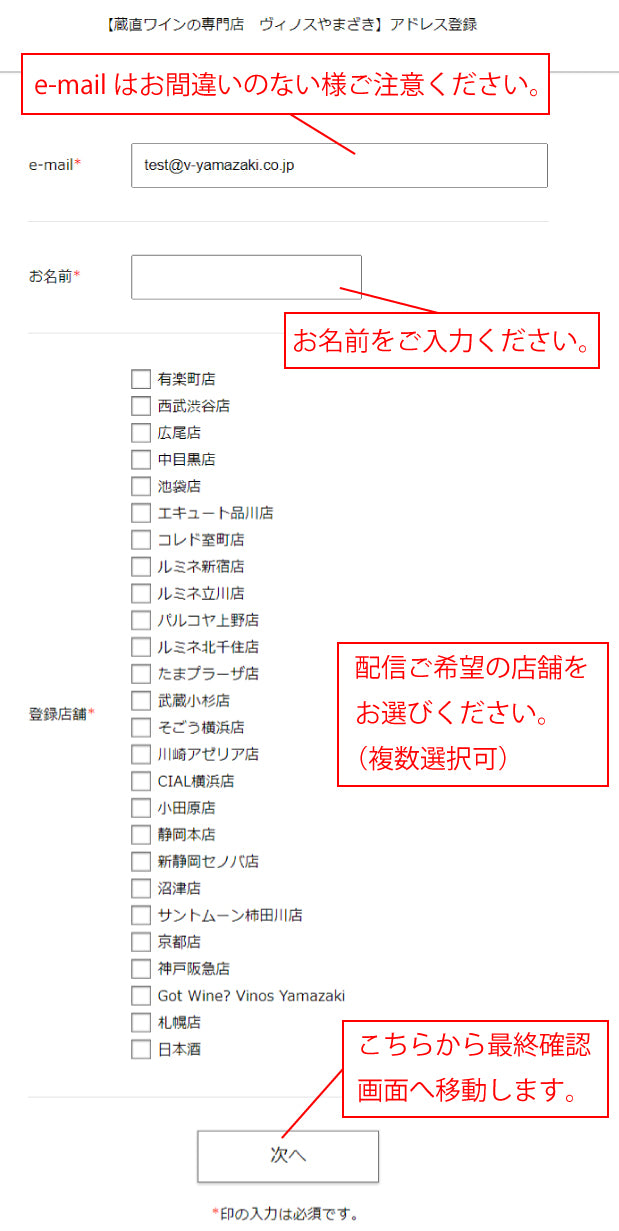本文に記載のURLとりご登録画面へお進みいただき、「e-mail」「お名前」「登録店舗」をご設定ください。