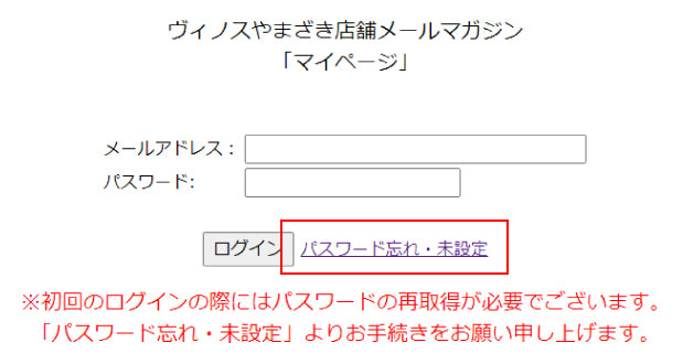 初回のログインの際にはパスワードの再取得が必要でございます。「パスワード忘れ・未設定」よりお手続きをお願い申し上げます。