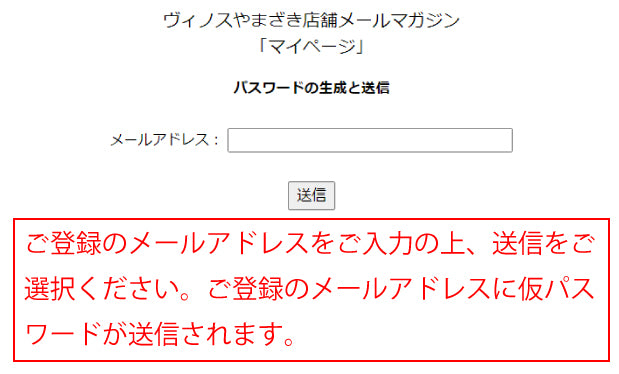 ご登録のメールアドレスをご入力の上、送信をご選択ください。ご登録のメールアドレスに仮パスワードが送信されます。
