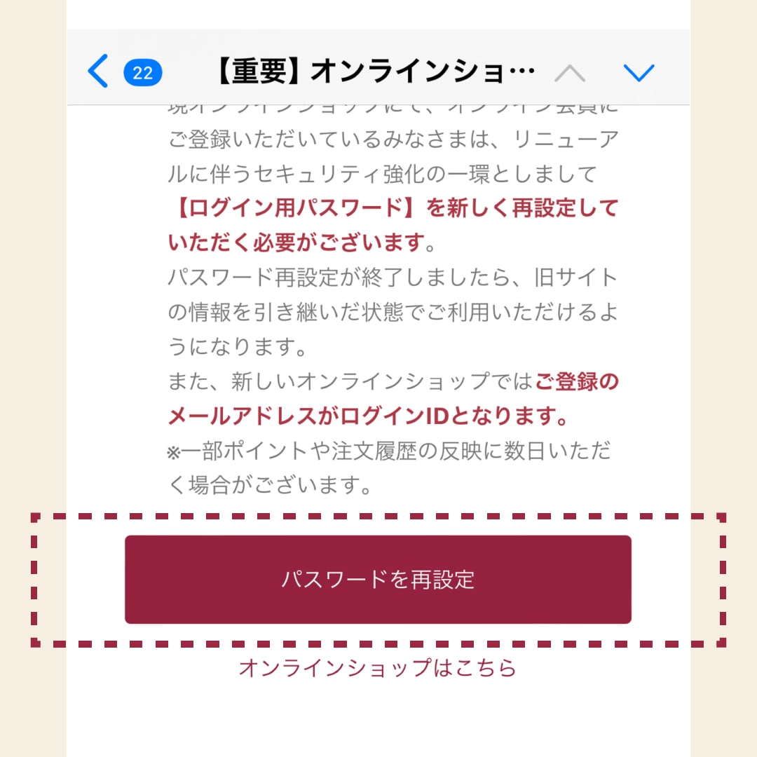 パスワード再設定の画面で、新しいパスワードを設定し手続きを進めてください。