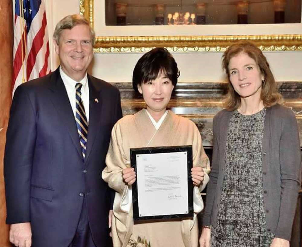 写真は授賞式の様子 種本祐子(中央)キャロライン・ケンディ氏 元駐日大使(右)