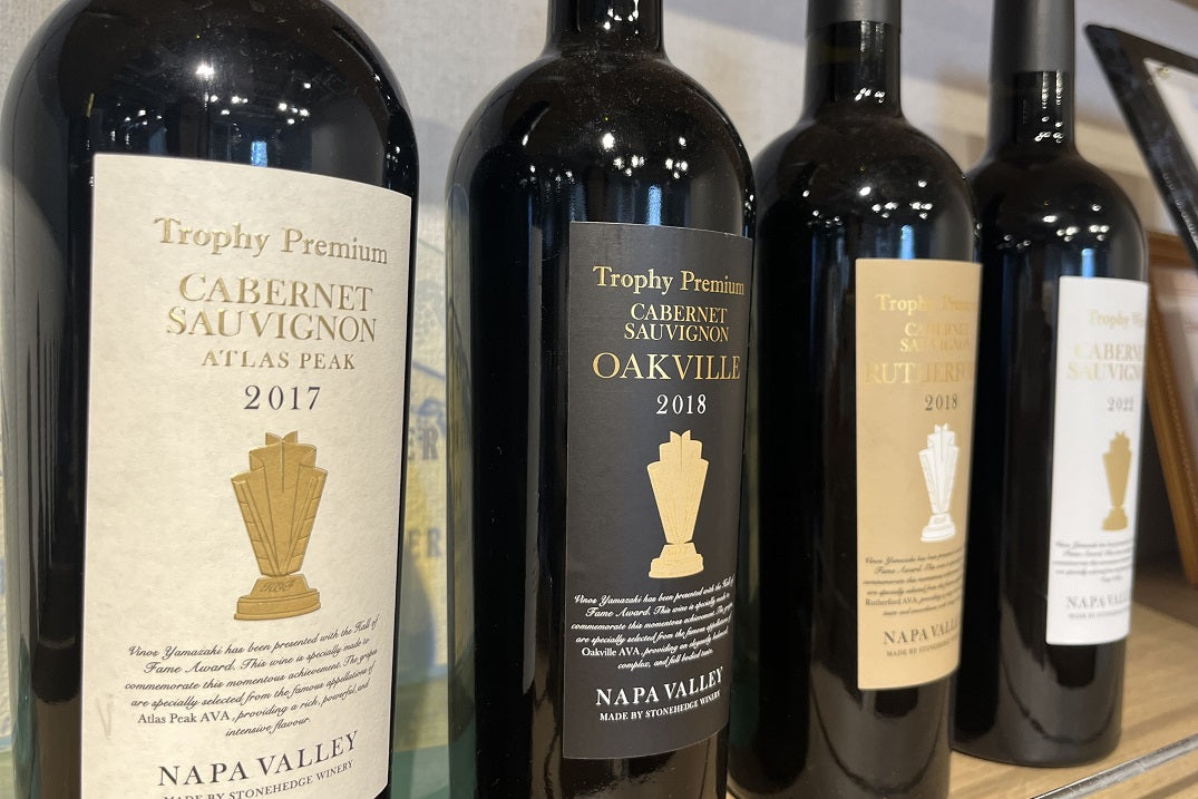 「トロフィーワイン」は、ヴィノスやまざき買付隊長の種本祐子がアメリカ大使館からワイン業界で初めて殿堂入り(ホール・オブ・フェーム)を賜った事を記念し、蔵元「ストーンヘッジ」と造り上げたプレミアム・ナパワイン。