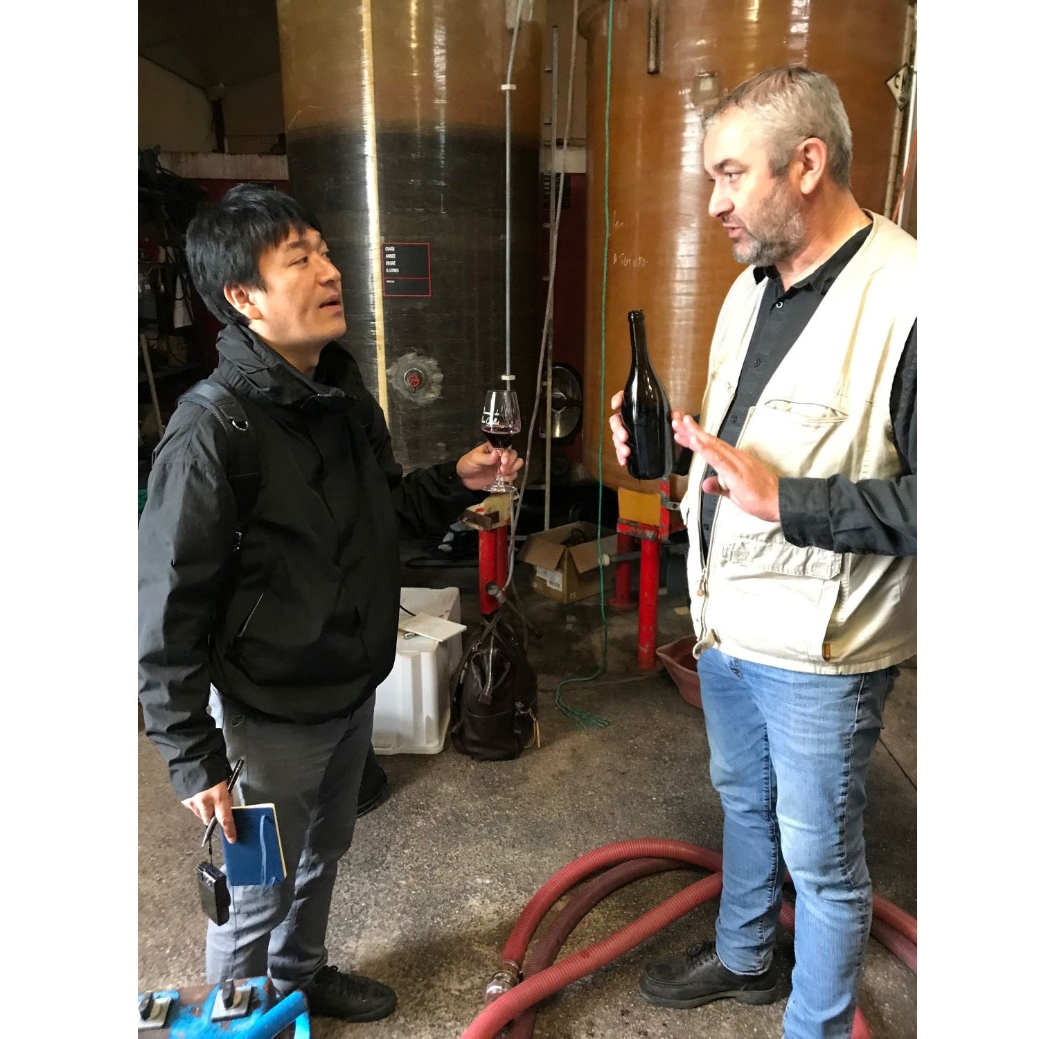 それから毎年現地に行き、一緒にディスカッションして、「濃くてもいいから、さらに果実味を豊富にしてほしい」と、完熟したぶどうだけでヌーヴォーを造るように依頼。結果として、「モルゴン村の中でも収穫が一番遅いのではないか・・・」と本人も言う程、果実味たっぷりのヌーヴォーとなりました。初心者でも上級者でも「本当に美味しい!」と言って頂ける程、当店大人気のヌーヴォーの造り手となりました。