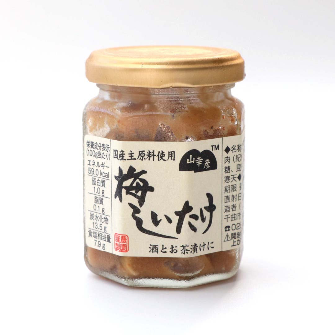 秋の味覚しいたけの魅力が存分に詰まった「梅しいたけ」。国産物にこだわり、紀州産梅肉と国産どんこ椎茸スライスを使用した、梅の爽やかさと椎茸の風味が絶妙な佃煮です。