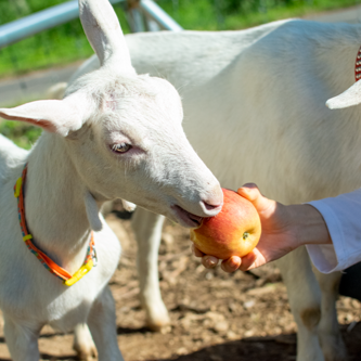 餌にフルーツを与える。徹底的なヤギの乳へのこだわり。